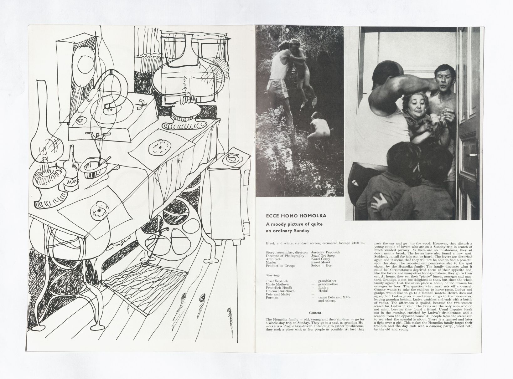 V uzavřeném a zacykleném světě hrdinů dochází i k dehonestaci původně až lyricky představeného přírodního prostředí. Poživační Homolkovi do lesa vyrážejí na houby a na piknik, rodinku i další víkendové návštěvníky však z lesa spolehlivě vypudí volání o pomoc znějící z nepřehledného porostu. Nad poetickým baletěním Heduš mezi stromy udělá tečku ženino finální hořekování vrcholící závěrečným tancem, který se mění v metaforu: zuřivě se hádající dvojice jsou do sebe zaklesnuté v dusivém manželském klinči. Závěrečná scéna opět ukazuje, že film Ecce homo Homolka je dílem silných kontrastů: z účelově zapnutého rádia nezazní taneční hudba, ale Beethovenova Óda na radost. Jde o podobně působivé využití diegetické hudby jako ve Formanových Láskách jedné plavovlásky (1965), v nichž Mildovu matku státní hymna znějící o půlnoci z televize „přistihne“ při tom, jak tajně prohledává kufr hlavní hrdinky[2]. Důraz na přítomnost televize a rozhlasu v rodinném časoprostoru není náhodný. Zoufalý průběh jedné letní neděle, ve které se nepodařilo nic včetně smažených řízků k obědu, zavinila podle samotných Homolkových nefungující televize – spásné „okno do světa“, které by dokázalo zatřít neexistující komunikaci mezi hrdiny (jejíž nedílnou součástí jsou natruc zamykané dveře). Pohled oknem na ulici nicméně odhaluje, že chování sousedů (kterým televizor patrně funguje) ovládá stejná intolerance a agresivita: mladík v autě svým troubením dokonce vyvolá temperamentní pouliční rvačku.