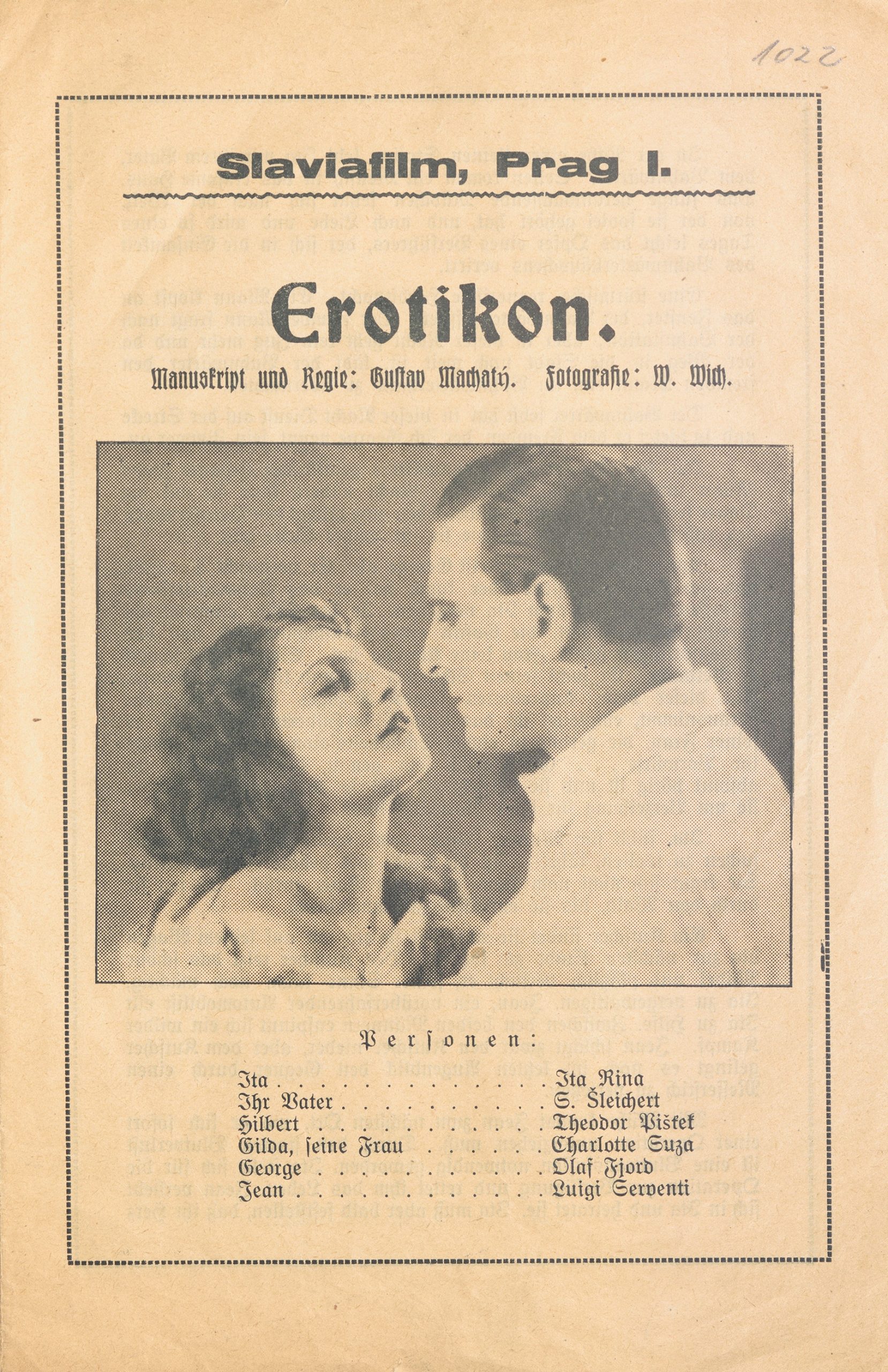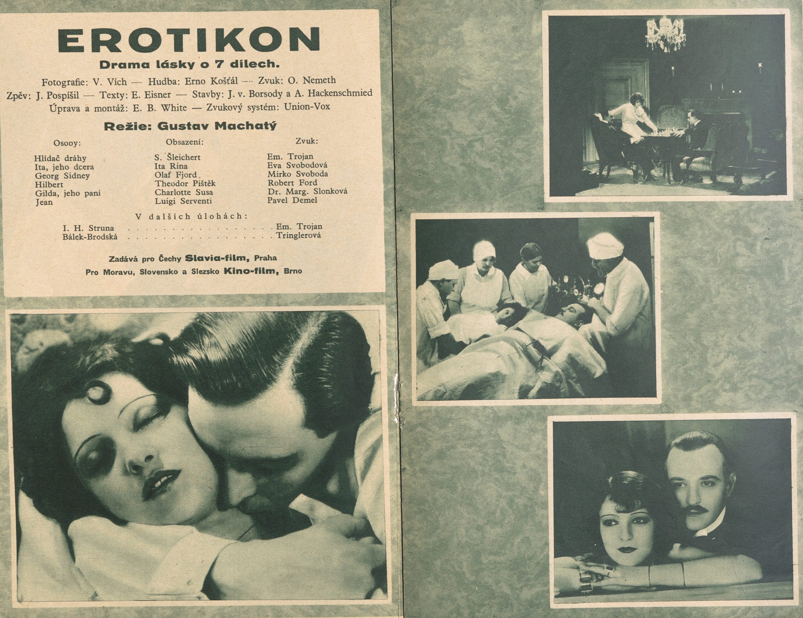 Neopominutelnou součástí Erotikonu jsou herecké výkony. Jak již bylo řečeno, jsou velmi pečlivě režírovány a vedeny v duchu výtvarné koncepce filmu. Herci jsou přesně komponováni do obrazu. Přesto však není Erotikon po herecké stránce vyrovnaný. Výrazností a zároveň moderností herectví nade všemi vyčnívá téměř epizodní role podváděného manžela Huberta v podání Theodora Pištěka. Také civilní projev Karla Schleicherta v roli Andreina otce patří v tomto filmu k nejlepším. Do sytosti využil Gustav Machatý i přirozeného hereckého talentu a tělesného půvabu Jugoslávky Ity Riny. V duchu dobových konvencí zůstává herecký výkon německé hvězdy té doby Charlotty Suzy coby záletné manželky. Nevýrazné se jeví výkony Němce Olafa Fjorda jako Andreina svůdce a Itala Luigi Serventiho jako jejího manžela.